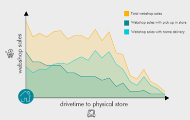 Établissez également un aperçu des temps de parcours estimés des clients numériques pour atteindre vos sites physiques. Le comptage des ‘clics’ va généralement permettre d’identifier un nombre important de clients en ligne dans la zone de chalandise secondaire des magasins physiques (‘effet de halo’). En ce qui concerne les consommateurs de la zone de chalandise tertiaire, il faudra probablement plus de temps pour les voir acheter en ligne, et il y aura du travail au niveau marketing : il faut leur faire connaître votre marque. Le point pour lequel on pourrait être pris en défaut est celui d’absence de magasin dans la région pour assurer le service après-vente des achats en ligne.