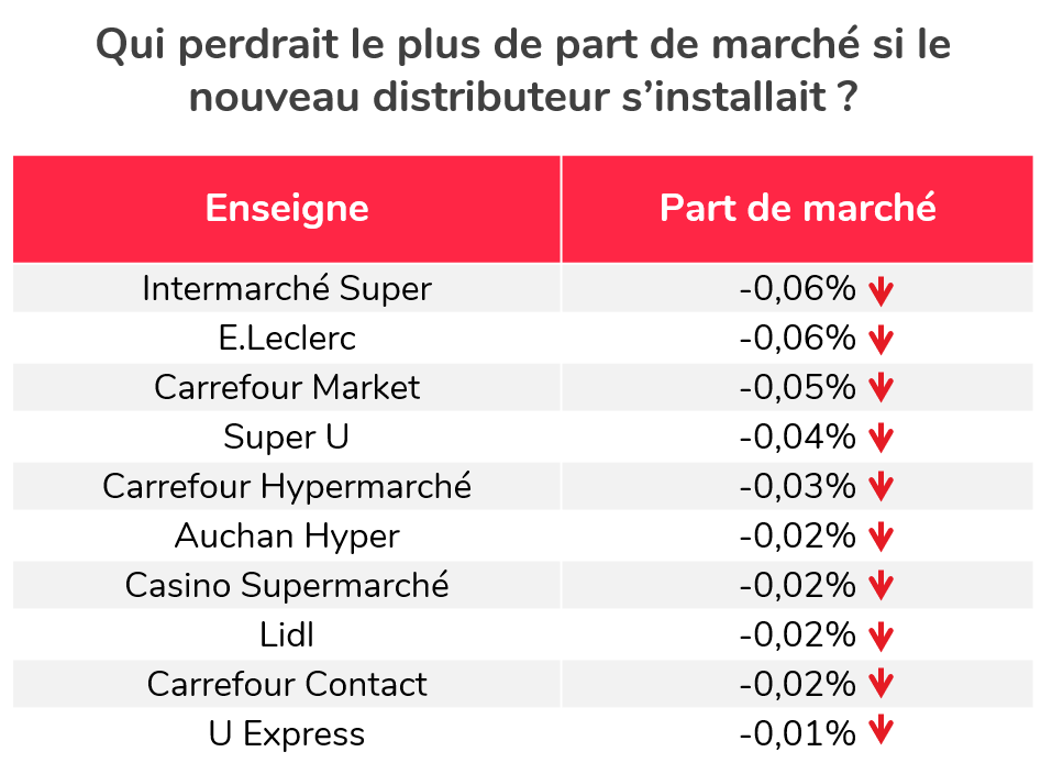 En s’implantant en France, le nouveau distributeur performerait donc relativement et impacterait logiquement les autres enseignes alimentaires. Toutefois, la moyenne de la perte de part de marché pour l’ensemble des magasins est estimée à seulement - 0,03%.