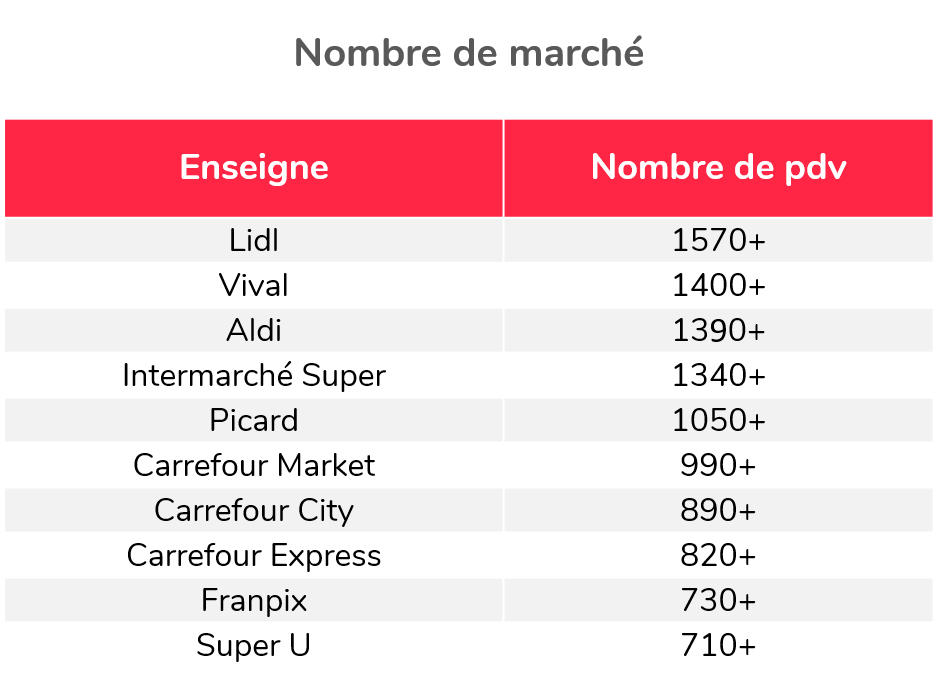 Une soixantaine de chaînes de supermarchés existe en France qui comptent un total d'environ 19 600 magasins alimentaires. Cela représente un supermarché pour 3 457 habitants.