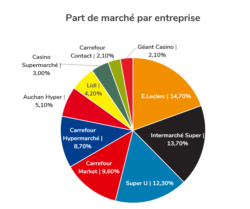 Si l’on raisonne en revanche en parts de marché, c’est E.Leclerc qui arrive en tête avec 14,7% de part de marché devant Les Mousquetaires (13,7%), Super U (12,3%) et Carrefour Market (9,6%) .