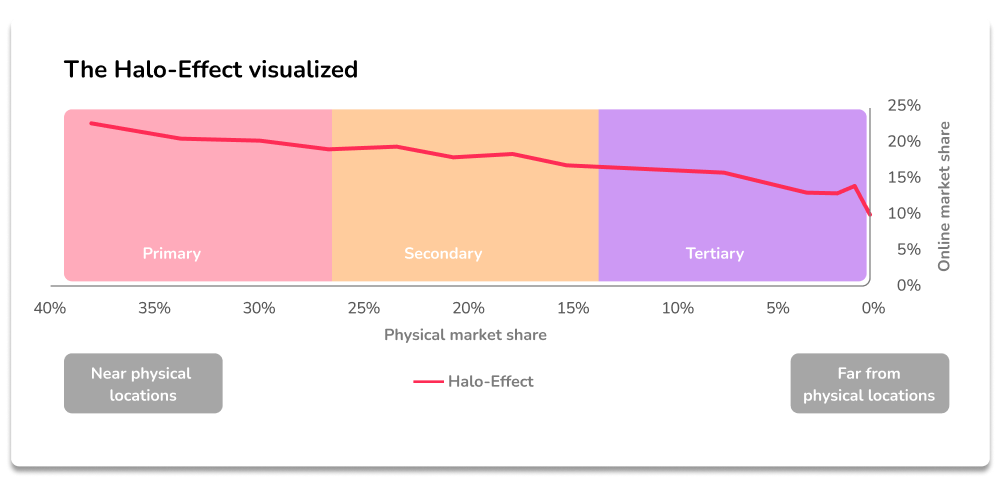 In de combinatie van online en fysiek zit een bijzonder grote kracht. Hoe dichter een klant bij een fysieke winkel woont, hoe groter de kans dat hij of zij in je webshop koopt. Je verkoopt dus online opvallend meer in de gebieden waar je ook een fysieke locatie hebt. Deze extra online omzet - die je vooral behaalt in je primaire en secundaire verzorgingsgebieden - noemen we het halo-effect.